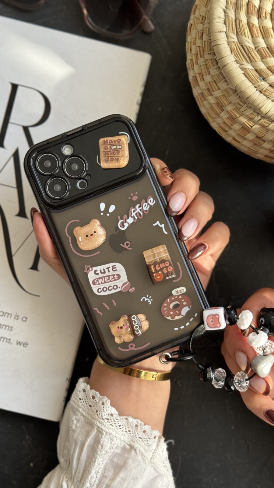 � طراحی فانتزی و برجسته قاب موبایل آیفون خرس چوکوبوبو کافی دونات