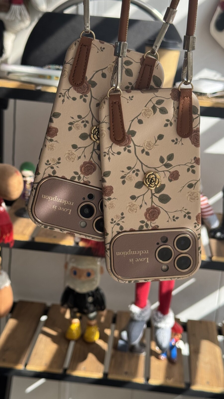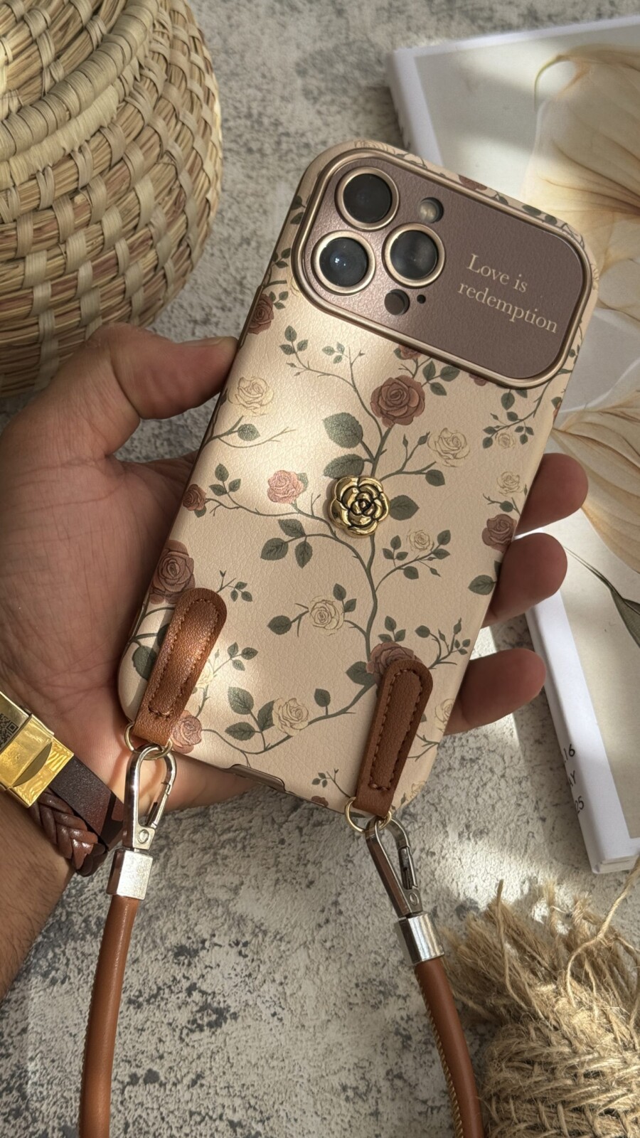 قاب موبایل ( آیفون ) گل رز فلورا قهوه ای + بندست چرمی